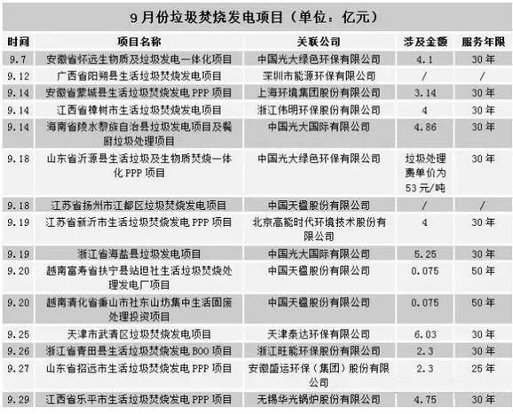 ??據(jù)不完全數(shù)據(jù)顯示,2017年9月共公開了15個垃圾焚燒發(fā)電項目,涉及金額超40億。中國光大綠色環(huán)保有限公司公開的3個新項目,總投資逾9億元,浙江省海鹽縣的垃圾發(fā)電項目單筆價值也在5億左右,江西樂平市垃圾焚燒項目也預(yù)計投資約4.7億元。